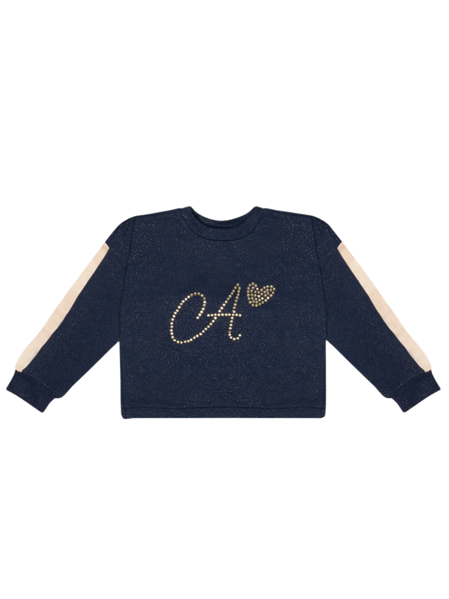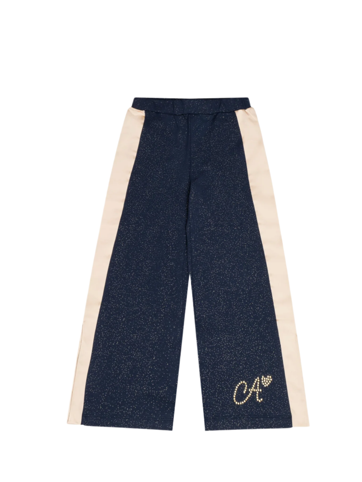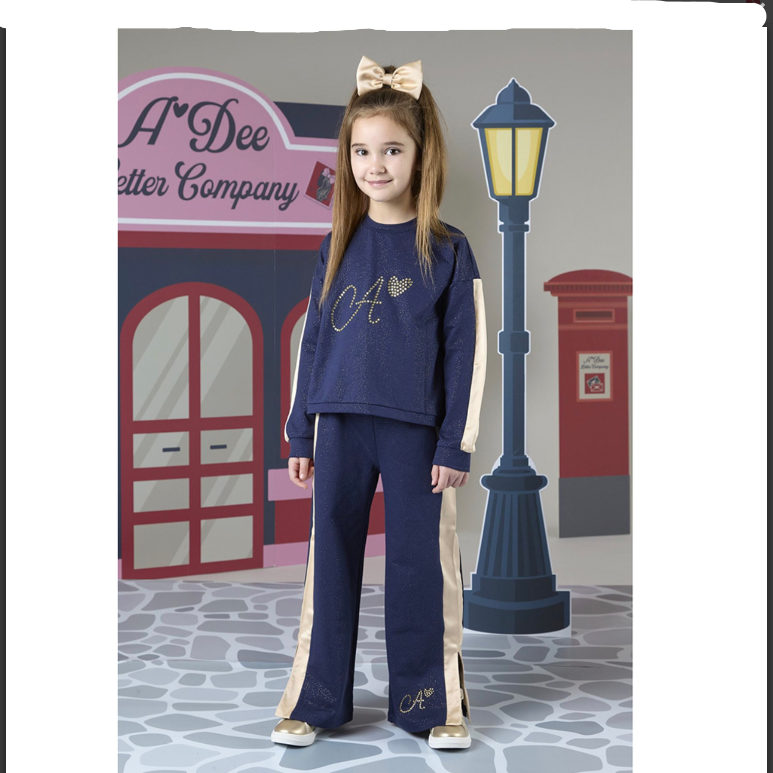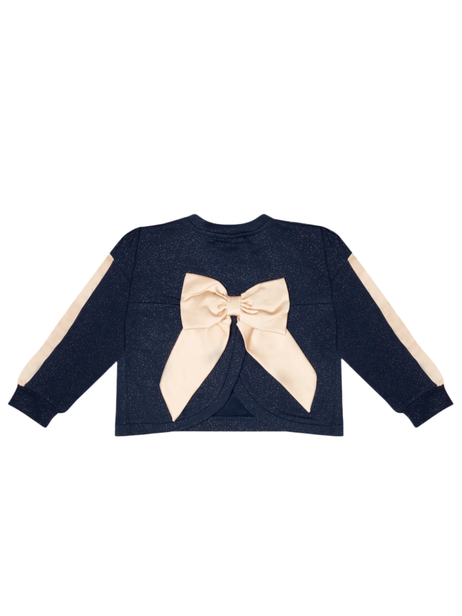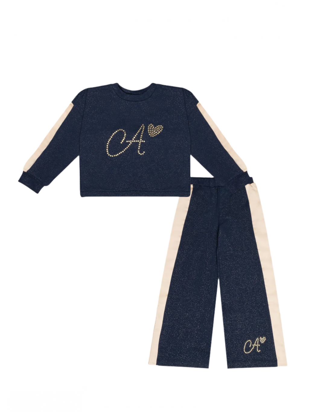 Glitter sweat tracksuit featuring jumper with large gold satin bow on back and diamante branding on front matched with flare joggers hosting gold satin side inserts finished with split hem at bottom.