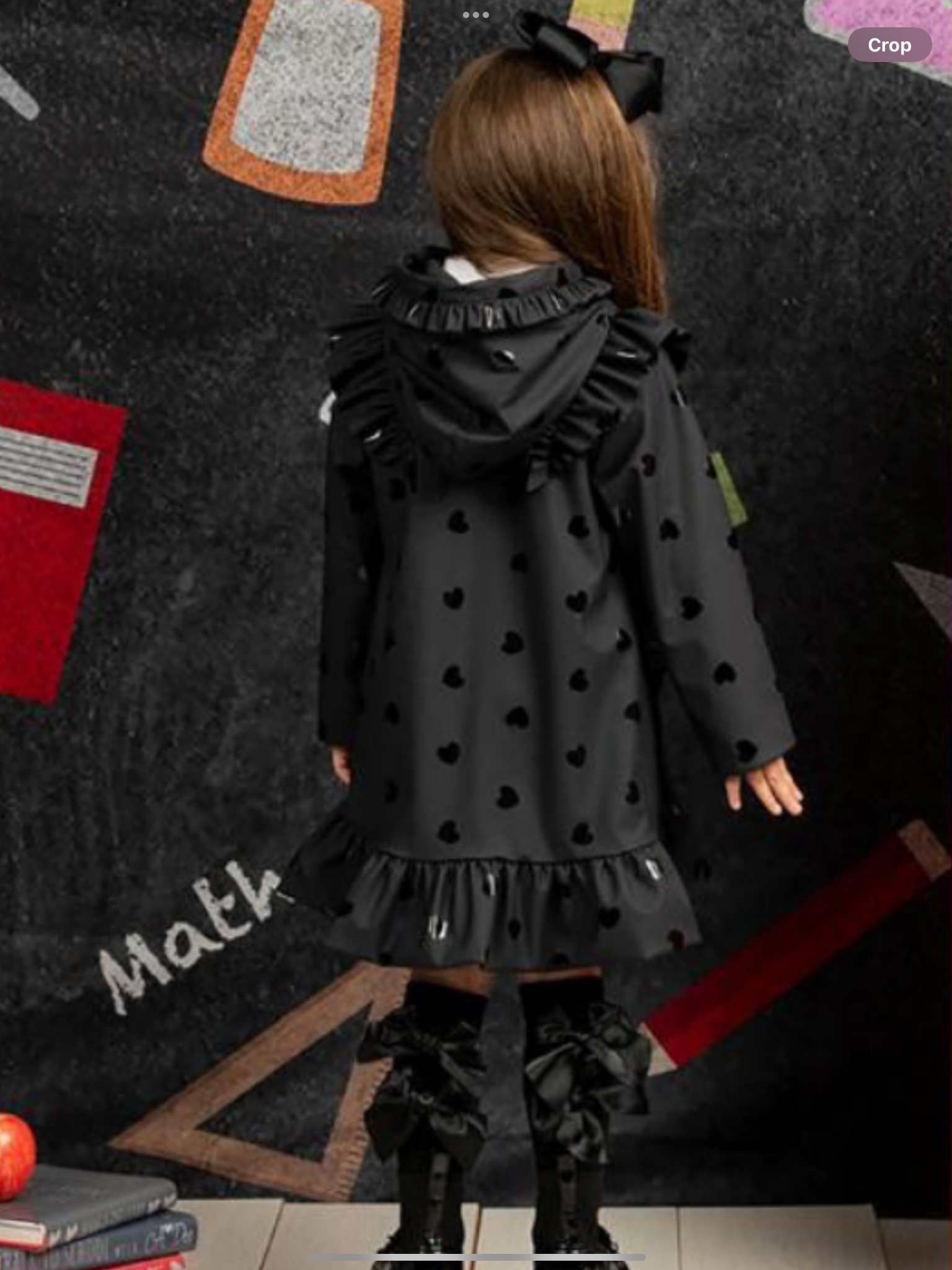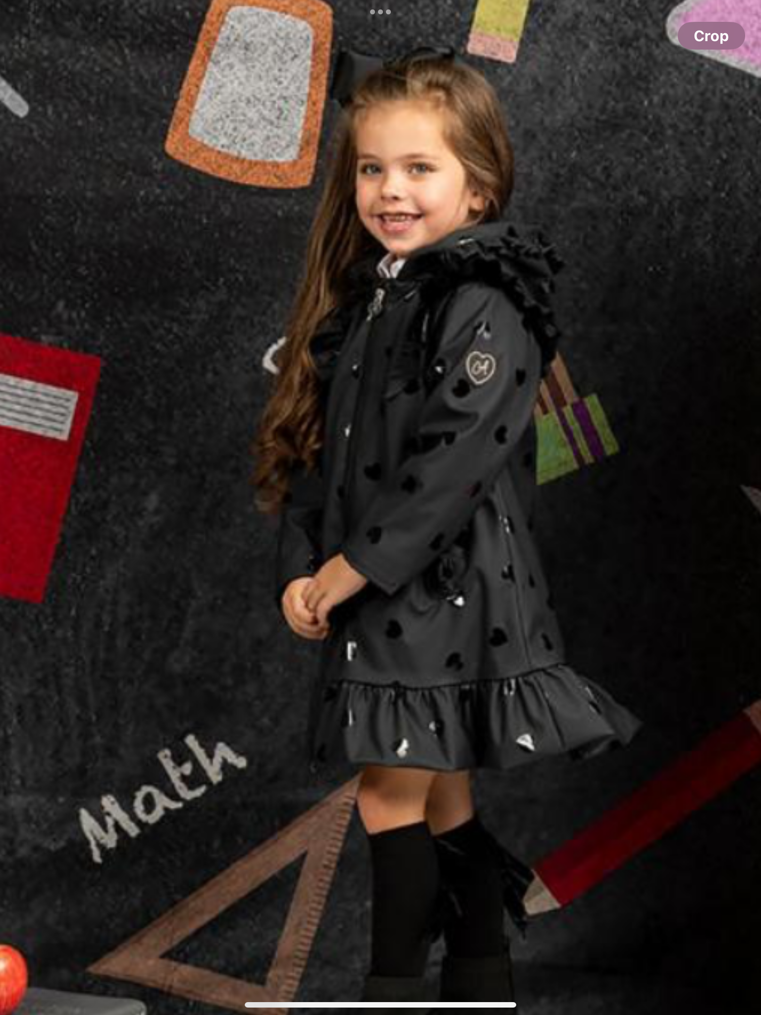 A Dee Back to School collection. Gorgeous Stella is the must have back to school raincoat. Stella features plenty of frills with frilled pockets and shoulders as well as a cute frilled hood and all over heart print. Complete with a silver reflective logo badge on one arm and a silver branded zip pull.