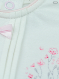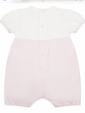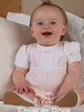 A simply stunning pink and white baby girls romper, perfect for new baby. The top of the romper is white and the lower part pink. Six little pintuck pleats, run from the soft round neck to waist. Pretty floral sprays sit either side of the pleats in shades of pink and grey with centre satin bow. The waist band and sleeve cuffs are also intricately embroidered, so feminine.