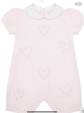 Similar to Jenna, Jody is an adorable baby girls pink romper with beautiful all over embroidered floral hearts. A soft rounded collar with ric-rac edge completes this stylish garment perfect for new baby.