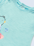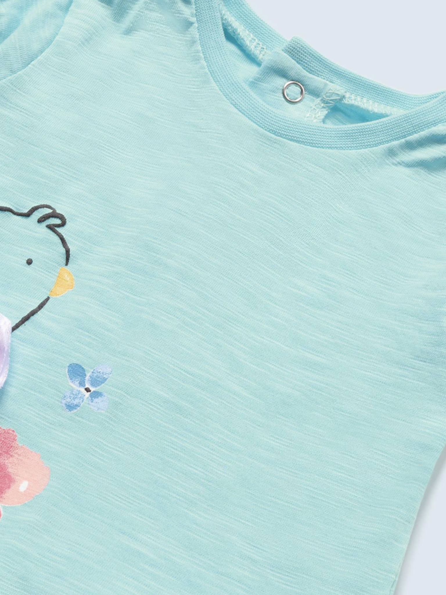 Short sleeved T-shirt for newborn. Round neckline. Snap-button fastening on the back to allow the garment to be put on easily.