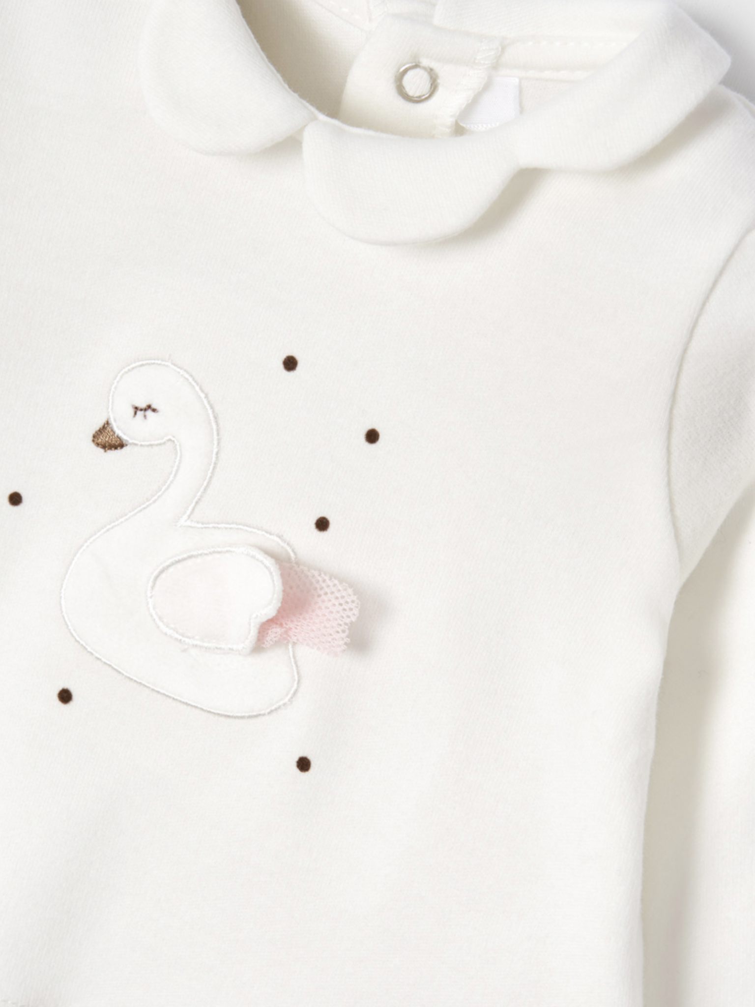 Long sleeved T-shirt for newborn. Snap-button fastening on the back to allow the garment to be put on easily.